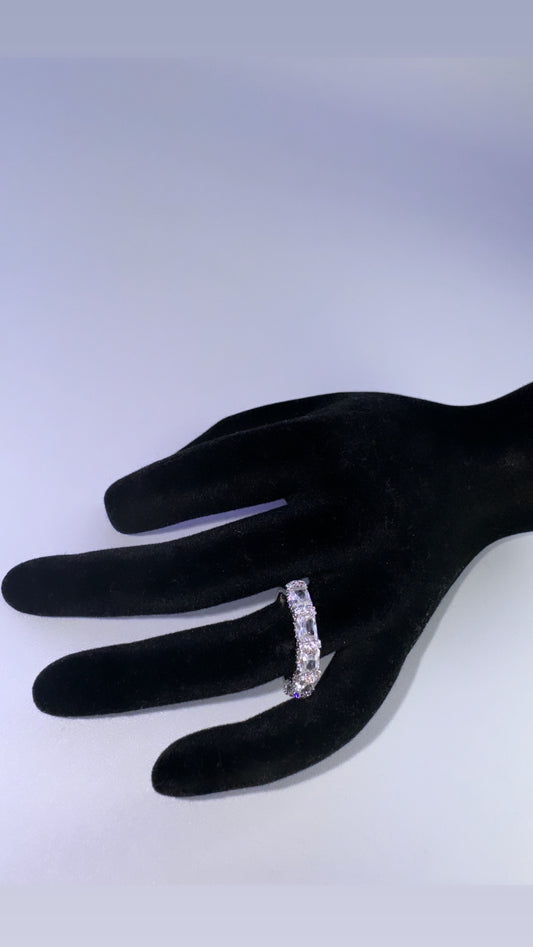 • This is a white cz rectangular diamond ring band with multiple rectangular diamonds around the ring