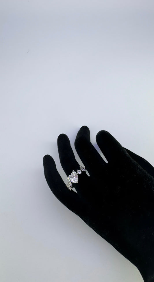 • A silver plated ring with a mini white pear shaped diamond as the central piece followed by very miniature white embroidery diamonds to each side of the pear central piece. The miniature diamonds only go to the sides partially, not all around the band so the silver band is still visible particularly at the back of the ring