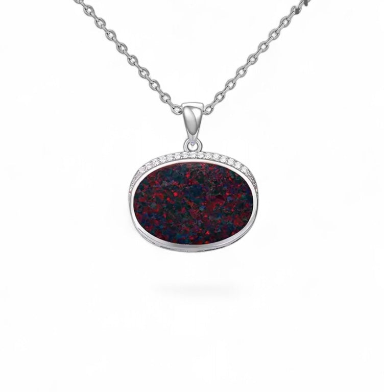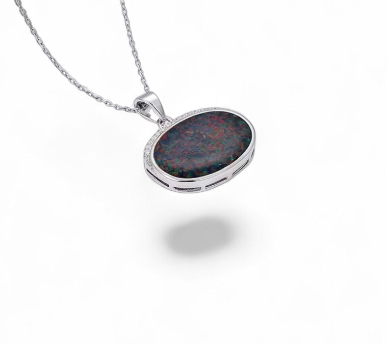Main stone: Synthetic polished inlaid opal with triple rhodium plating